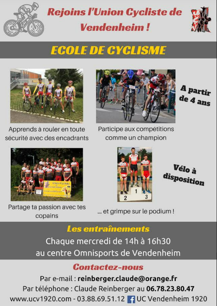 L’Union Cycliste de Vendenheim créé en 1920 est un Club cycliste au nord de Strasbourg o l’on pratique le vélo sous toutes ses formes (Route, Piste, Cyclo, Salle…) et de part ce nouveau site se veut de vous donner l’essentiel de l’activité de notre Association !